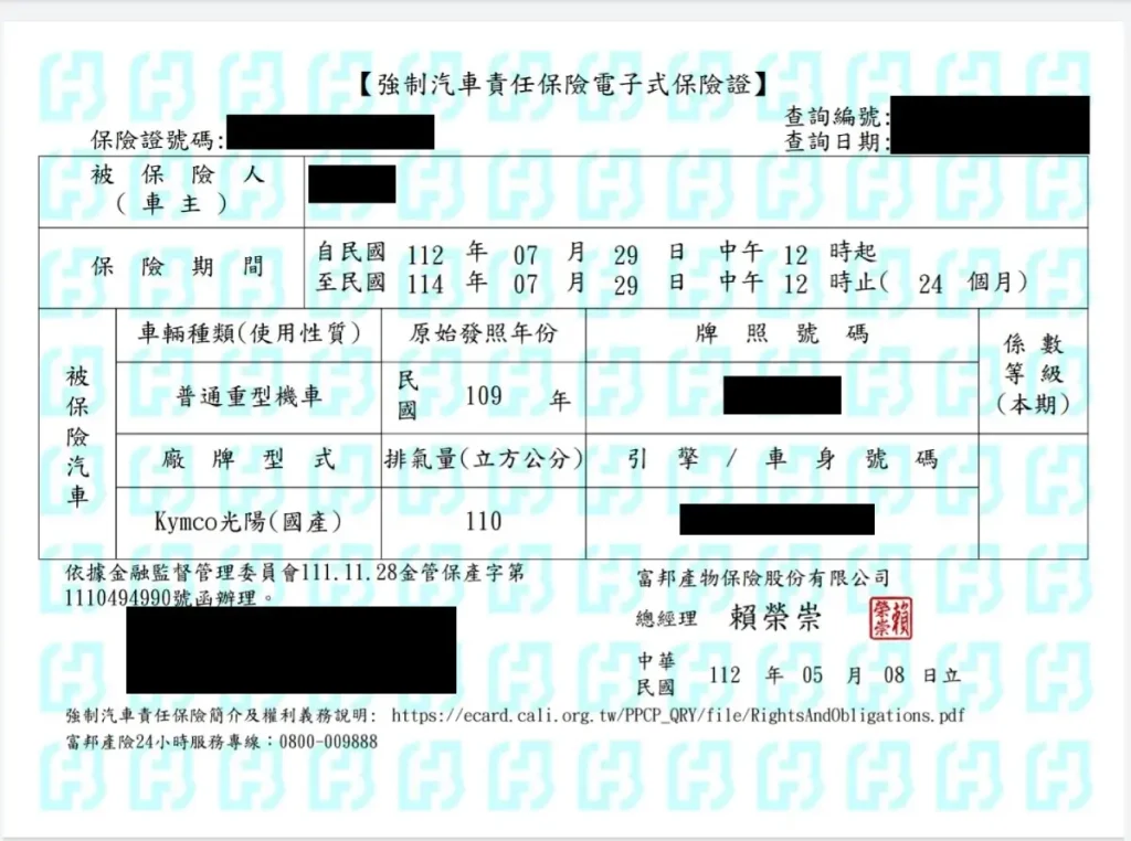- 強制機車保險證明(需在有效期限內)